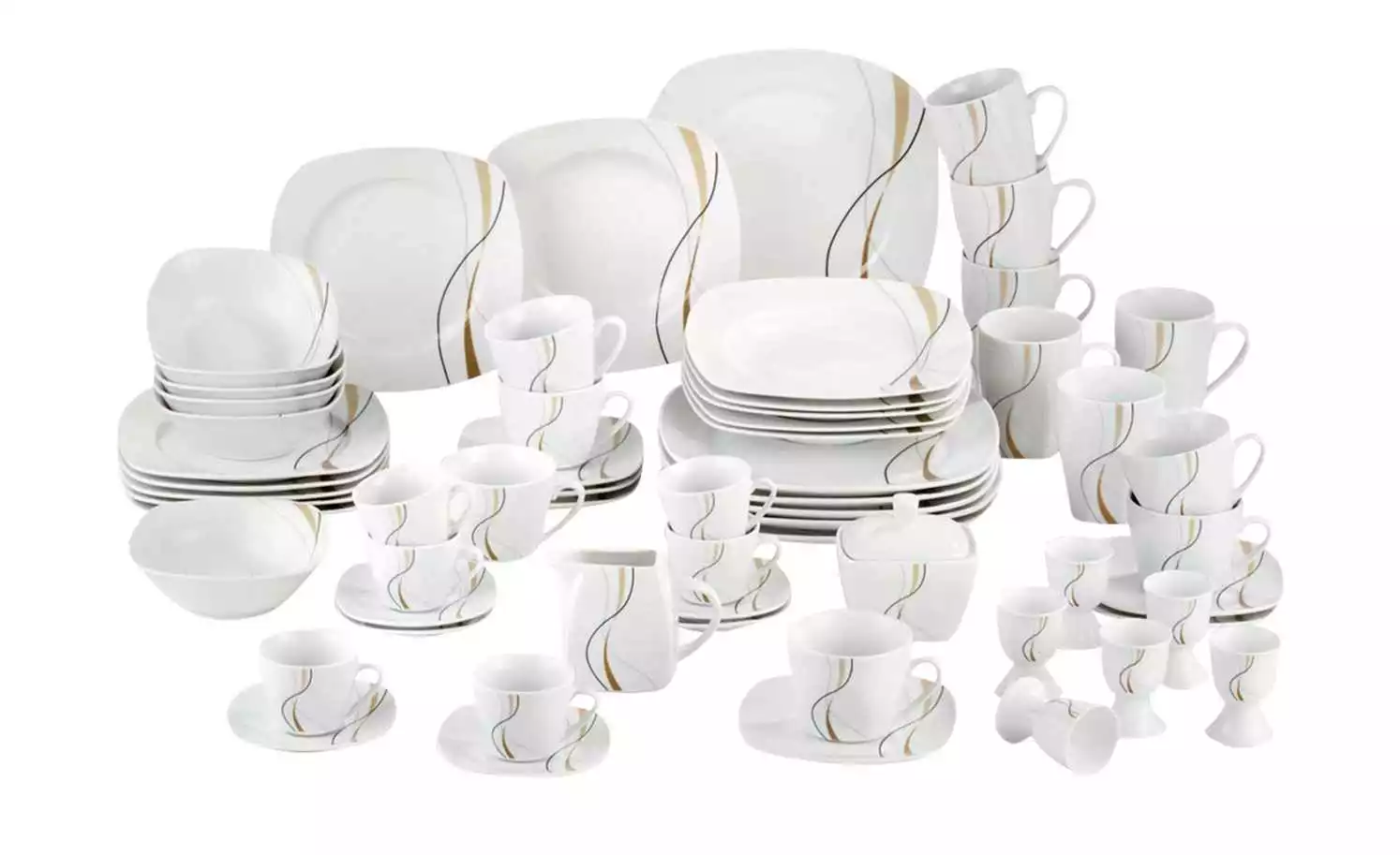 - Lieferumfang / mitgeliefertes Zubehör: 1 x Milchkännchen, 6 x Espressotasse, 6 x Salatschale Ø ca. 16 cm, 1 x Zuckerdose, 6 x Kaffeetasse, 6 x Espressountertasse, 6 x Eierbecher, 6 x Untertasse, 6 x Kaffeebecher , 6 x Teller flach, 6 x Dessertteller, 6 x Teller tief